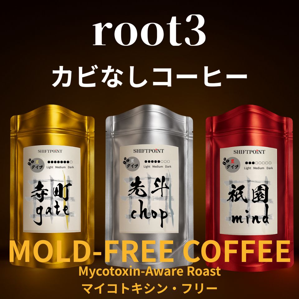 3️⃣ “はじめてのカビなしコーヒー”、3種飲み比べセット。クリーンな朝習慣をはじめたいあなたへ、まずはここを基軸(root) に、SHIFTPOiNTの3種の“カビなしコーヒー”を気軽に試せる、お試しセット(各100g×3)です。